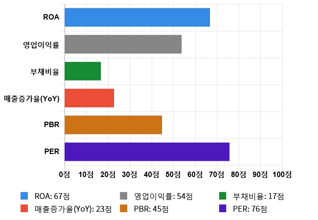 그리고 효율성(ROA) 역시 도드라지는 편이다. 효율성 점수는 67점으로 두번째로 높은 점수를 기록했다. ROA은 전체 시장 내 634위를 기록하며 상위 32.95%에 위치했다. 업종별로는 232위를 기록하며 상위 40.74%에 위치했다.