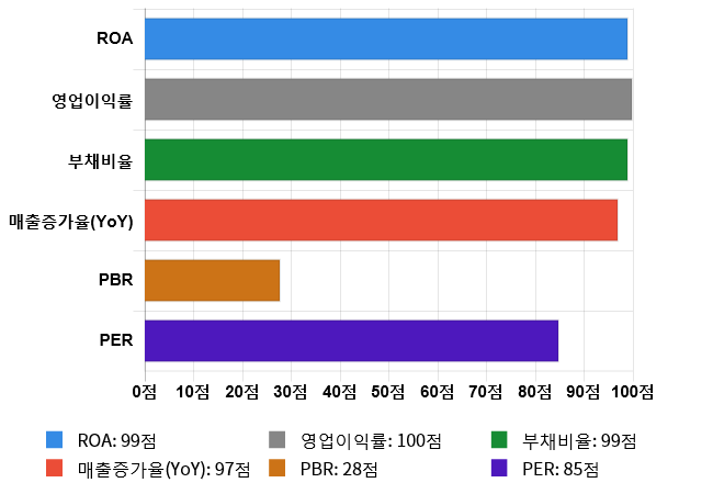 그리고 효율성(ROA) 역시 도드라지는 편이다. 효율성 점수는 99점으로 두번째로 높은 점수를 기록했다. ROA은 전체 시장 내 28위를 기록하며 상위 1.41%에 위치했다. 업종별로는 1위를 기록하며 상위 0%에 위치했다.