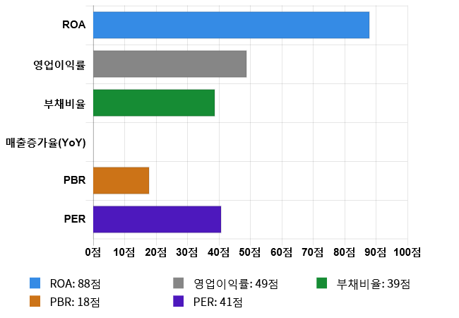 (위의 AI인공지능 점수는 재무 데이터를 기반으로 전체 상장 종목과 비교/분석하여 도출한 점수로 높은 점수가 반드시 높은 수익률을 보장하지 않습니다. 위의 자료는 당사의 추천 종목이 아니며, 투자 시 참고용으로 제시해드리는 것입니다.)