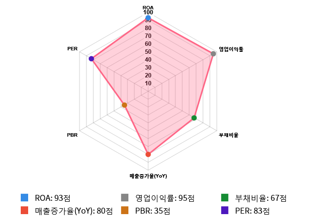 그리고 효율성(ROA) 역시 도드라지는 편이다. 효율성 점수는 93점으로 두번째로 높은 점수를 기록했다. ROA는 전체 시장 내 130위를 기록하며 상위 6.72%에 위치했다. 업종별로는 66위를 기록하며 상위 11.46%에 위치했다.