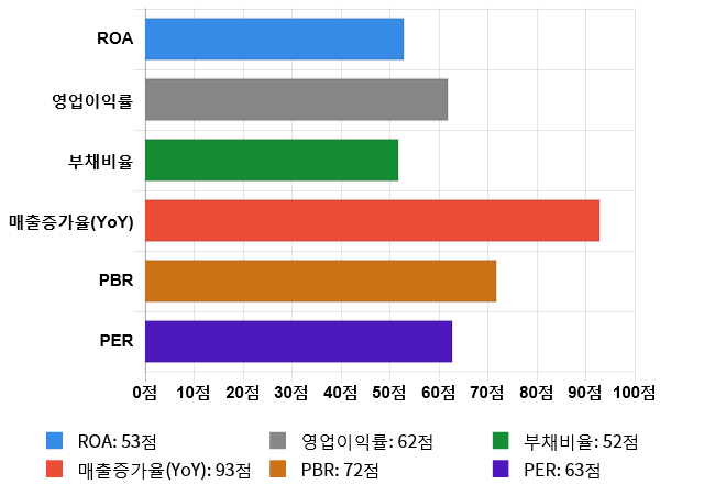 (위의 AI인공지능 점수는 재무 데이터를 기반으로 전체 상장 종목과 비교/분석하여 도출한 점수로 높은 점수가 반드시 높은 수익률을 보장하지 않습니다. 위의 자료는 당사의 추천 종목이 아니며, 투자 시 참고용으로 제시해드리는 것입니다.)