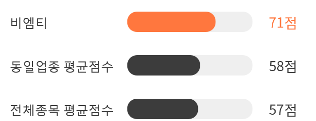 AI 인공지능 분석을 통한 비엠티의 종목 종합 스코어는 71점을 기록했다.