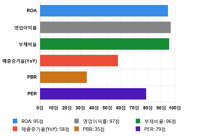 그리고 안정성(부채비율) 역시 도드라지는 편이다. 안정성 점수는 96점으로 두번째로 높은 점수를 기록했다. 부채비율은 전체 시장 내 108위를 기록하며 상위 3.99%에 위치했다. 업종별로는 22위를 기록하며 상위 9.05%에 위치했다.