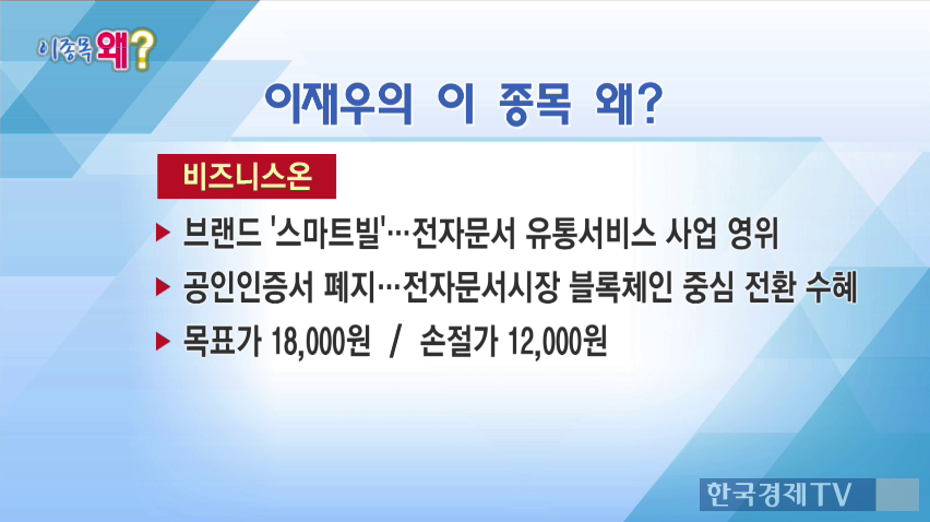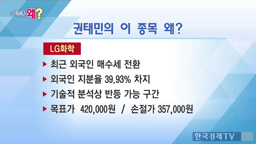 LG화학 -최근 외국인 매수세 전환 -외국인 지분율 39.93% -기술적 분석상 반등 가능 구간 -목표가 420,000원 -손절가 357,000원 비즈니스온 -브랜드 스마트빌 전자문서 유통서비스 사업 영위 -공인인증서 폐지 전자문서시장 블록체인 중심 전환 수혜 -목표가 18,000원 -손절가 12,000원
