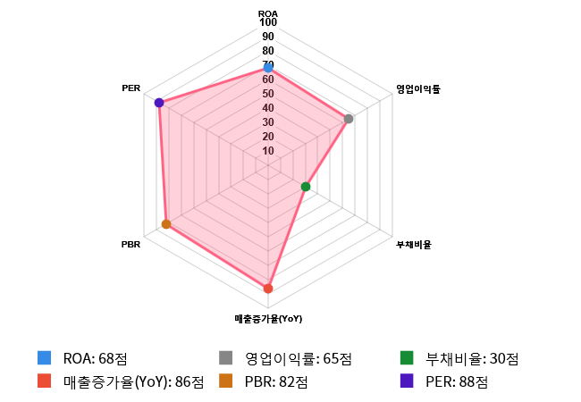 그리고 성장성(매출증가율(YoY)) 역시 도드라지는 편이다. 성장성 점수는 86점으로 두번째로 높은 점수를 기록했다. 매출증가율(YoY)은 전체 시장 내 260위를 기록하며 상위 14.4%에 위치했다. 업종별로는 29위를 기록하며 상위 7.57%에 위치했다.