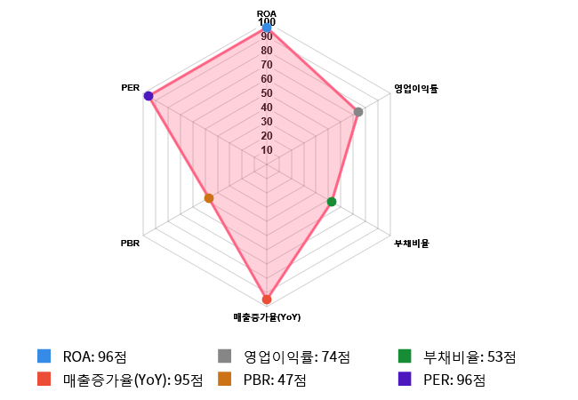 그리고 성장성(매출증가율(YoY)) 역시 도드라지는 편이다. 성장성 점수는 95점으로 두번째로 높은 점수를 기록했다. 매출증가율(YoY)은 전체 시장 내 98위를 기록하며 상위 5.39%에 위치했다. 업종별로는 14위를 기록하며 상위 4.14%에 위치했다.