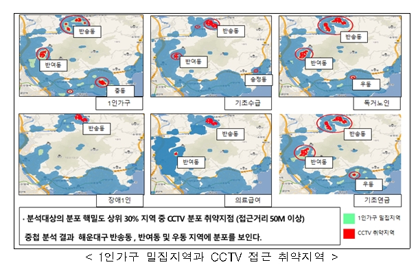 부산시 해운대구는 1인 가구 취약계층 분포와, 1인 가구 밀집지역 중 무더위 쉼터 및 CCTV 접근 취약지역 등을 알아냈습니다.