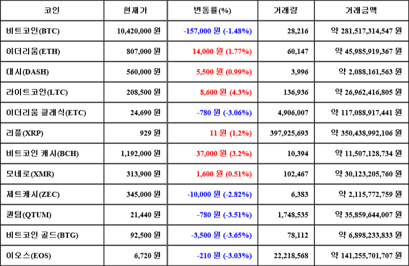 현재 가상화폐 거래소 "빗썸"에 따르면 가상화폐 대장 격인 비트코인의 시세는 24시간 전 대비 157,000원(-1.48%) 하락한 10,420,000원에 거래되고 있다.