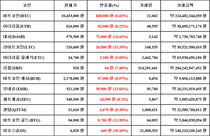 또한, 모네로(13.82%, 321,100원), 라이트코인(13.35%, 210,600원), 비트코인 골드(11.38%, 94,900원), 이오스(10.36%, 6,820원), 비트코인 캐시(8.97%, 1,178,000원), 퀀텀(8.38%, 21,610원), 이더리움(8.22%, 816,000원), 제트캐시(8.2%, 349,500원), 리플(7.49%, 918원), 이더리움 클래식(5.09%, 24,760원)은 상승세를 보이고 있다.