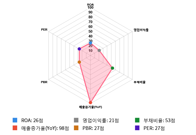 그리고 안정성(부채비율) 역시 도드라지는 편이다. 안정성 점수는 52점으로 두번째로 높은 점수를 기록했다. 부채비율은 전체 시장 내 960위를 기록하며 상위 47.52%에 위치했다. 업종별로는 122위를 기록하며 상위 34.91%에 위치했다.