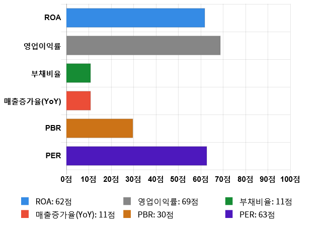 (위의 AI인공지능 점수는 재무 데이터를 기반으로 전체 상장 종목과 비교/분석하여 도출한 점수로 높은 점수가 반드시 높은 수익률을 보장하지 않습니다. 위의 자료는 당사의 추천 종목이 아니며, 투자 시 참고용으로 제시해드리는 것입니다.)