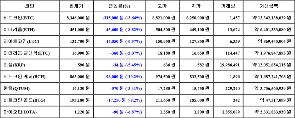 현재 가상화폐 거래소 "코인원"에 따르면 가상화폐 대장 격인 비트코인의 시세는 24시간 전 대비 315,000원(-3.64%) 하락한 8,346,000원에 거래되고 있다.