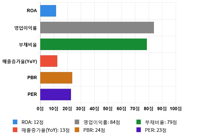 그리고 안정성(부채비율) 역시 도드라지는 편이다. 안정성 점수는 79점으로 두번째로 높은 점수를 기록했다. 부채비율은 전체 시장 내 648위를 기록하며 상위 20.78%에 위치했다. 업종별로는 222위를 기록하며 상위 24.33%에 위치했다.
