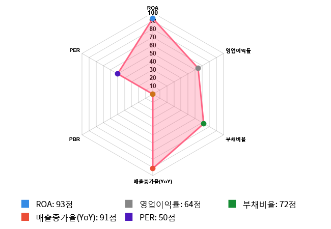 그리고 성장성(매출증가율(YoY)) 역시 도드라지는 편이다. 성장성 점수는 91점으로 두번째로 높은 점수를 기록했다. 매출증가율(YoY)은 전체 시장 내 138위를 기록하며 상위 8.65%에 위치했다. 업종별로는 1위를 기록하며 상위 0%에 위치했다.