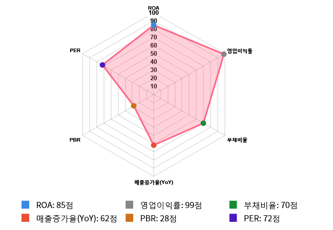그리고 효율성(ROA) 역시 도드라지는 편이다. 효율성 점수는 85점으로 두번째로 높은 점수를 기록했다. ROA는 전체 시장 내 252위를 기록하며 상위 14.99%에 위치했다. 업종별로는 36위를 기록하며 상위 11.51%에 위치했다.