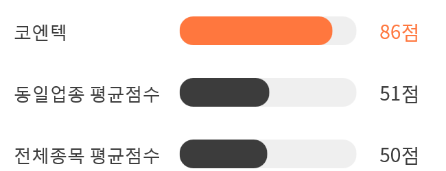 AI 인공지능 분석을 통한 코엔텍의 종목 종합 스코어는 86점을 기록했다.