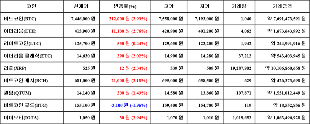 현재 가상화폐 거래소 "코인원"에 따르면 가상화폐 대장 격인 비트코인의 시세는 24시간 전 대비 212,000원(2.93%) 상승한 7,446,000원에 거래되고 있다.