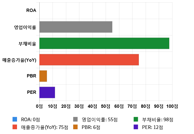 (위의 AI인공지능 점수는 재무 데이터를 기반으로 전체 상장 종목과 비교/분석하여 도출한 점수로 높은 점수가 반드시 높은 수익률을 보장하지 않습니다. 위의 자료는 당사의 추천 종목이 아니며, 투자 시 참고용으로 제시해드리는 것입니다.)