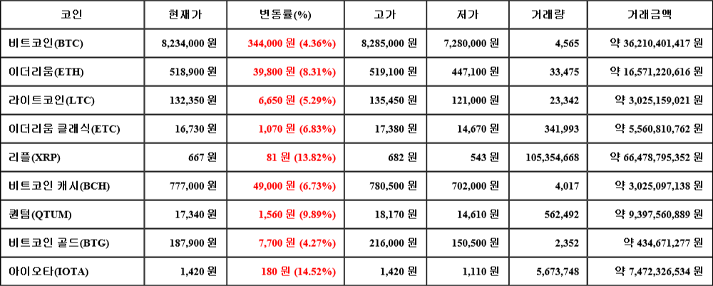 현재 가상화폐 거래소 "코인원"에 따르면 가상화폐 대장 격인 비트코인의 시세는 24시간 전 대비 344,000원(4.36%) 상승한 8,234,000원에 거래되고 있다.