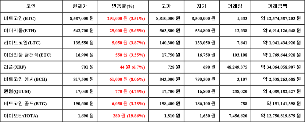 현재 가상화폐 거래소 "코인원"에 따르면 가상화폐 대장 격인 비트코인의 시세는 24시간 전 대비 291,000원(3.51%) 상승한 8,587,000원에 거래되고 있다.