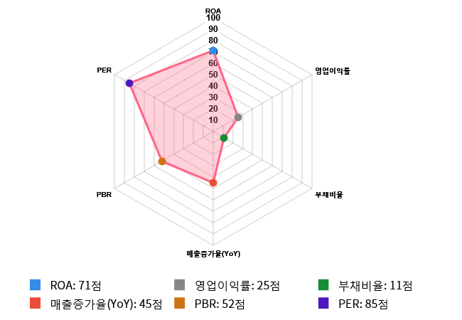 그리고 효율성(ROA) 역시 도드라지는 편이다. 효율성 점수는 71점으로 두번째로 높은 점수를 기록했다. ROA는 전체 시장 내 559위를 기록하며 상위 28.69%에 위치했다. 업종별로는 62위를 기록하며 상위 27.48%에 위치했다.