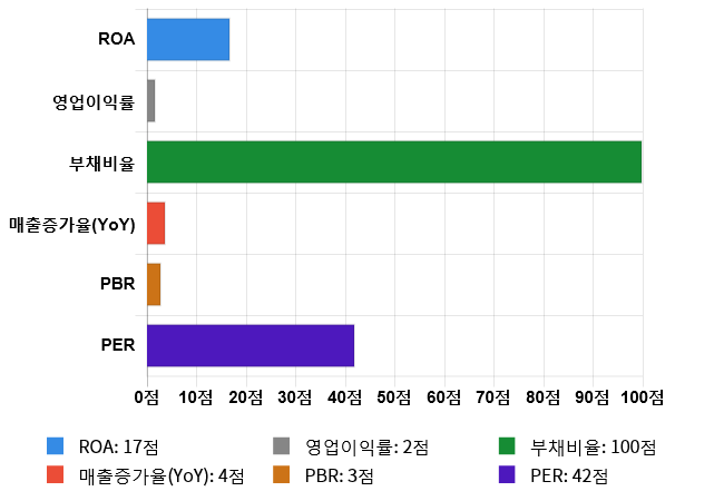 (위의 AI인공지능 점수는 재무 데이터를 기반으로 전체 상장 종목과 비교/분석하여 도출한 점수로 높은 점수가 반드시 높은 수익률을 보장하지 않습니다. 위의 자료는 당사의 추천 종목이 아니며, 투자 시 참고용으로 제시해드리는 것입니다.)