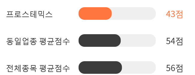 AI 인공지능 분석을 통한 프로스테믹스의 종목 종합 스코어는 43점을 기록했다.