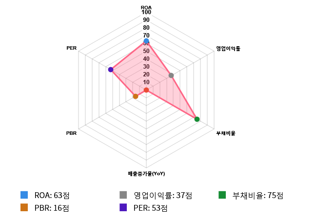 그리고 효율성(ROA) 역시 도드라지는 편이다. 효율성 점수는 63점으로 두번째로 높은 점수를 기록했다. ROA는 전체 시장 내 727위를 기록하며 상위 37.27%에 위치했다. 업종별로는 140위를 기록하며 상위 36.1%에 위치했다.