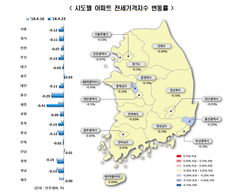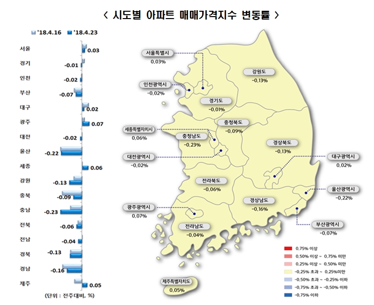 지방은 광주(0.07%), 세종(0.06%), 제주(0.05%)는 올랐고, 충남(-0.23%), 울산(-0.22%), 경남(-0.16%)은 내렸습니다.