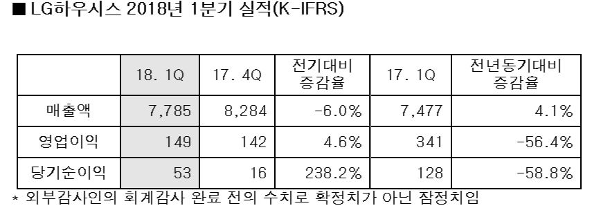LG하우시스는 1분기 매출액이 7,785억원, 영업이익이 149억원을 기록했다고 27일 밝혔습니다. 이는 전분기보다 매출은 6% 감소, 영업이익은 4.6% 증가한 수준입니다. 또 1년 전에 비해서는 매출은 4.1% 늘었고, 영업이익은 56.4% 감소했습니다.