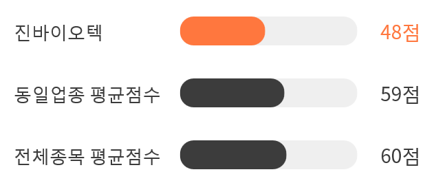 AI 인공지능 분석을 통한 진바이오텍의 종목 종합 스코어는 48점을 기록했다.