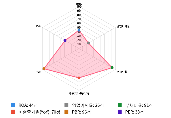 그리고 안정성(부채비율) 역시 도드라지는 편이다. 안정성 점수는 91점으로 두번째로 높은 점수를 기록했다. 부채비율은 전체 시장 내 186위를 기록하며 상위 8.61%에 위치했다. 업종별로는 17위를 기록하며 상위 6.64%에 위치했다.