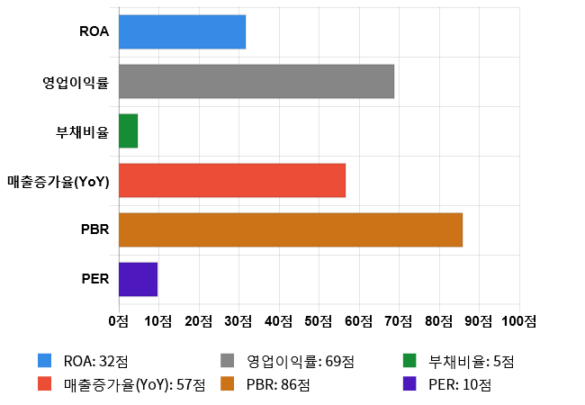 그리고 수익성(영업이익률) 역시 도드라지는 편이다. 수익성 점수는 69점으로 두번째로 높은 점수를 기록했다. 영업이익률은 전체 시장 내 601위를 기록하며 상위 30.69%에 위치했다. 업종별로는 5위를 기록하며 상위 20%에 위치했다.