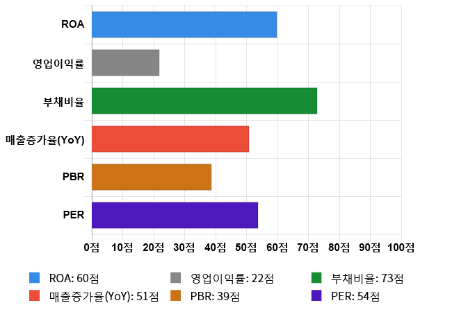 그리고 효율성(ROA) 역시 도드라지는 편이다. 효율성 점수는 59점으로 두번째로 높은 점수를 기록했다. ROA는 전체 시장 내 790위를 기록하며 상위 40.5%에 위치했다. 업종별로는 125위를 기록하며 상위 36.8%에 위치했다.
