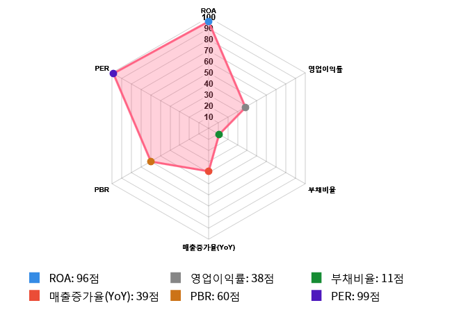 그리고 효율성(ROA) 역시 도드라지는 편이다. 효율성 점수는 96점으로 두번째로 높은 점수를 기록했다. ROA는 전체 시장 내 71위를 기록하며 상위 3.59%에 위치했다. 업종별로는 6위를 기록하며 상위 1.48%에 위치했다.