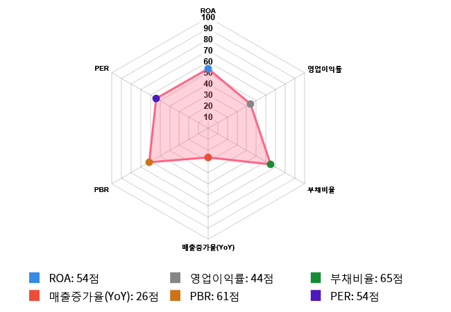 그리고 저평가성2(PBR) 역시 도드라지는 편이다. 저평가성2 점수는 61점으로 두번째로 높은 점수를 기록했다. PBR은 전체 시장 내 730위를 기록하며 상위 38.96%에 위치했다. 업종별로는 164위를 기록하며 상위 51.26%에 위치했다.