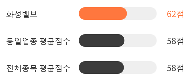 AI 인공지능 분석을 통한 화성밸브의 종목 종합 스코어는 62점을 기록했다.