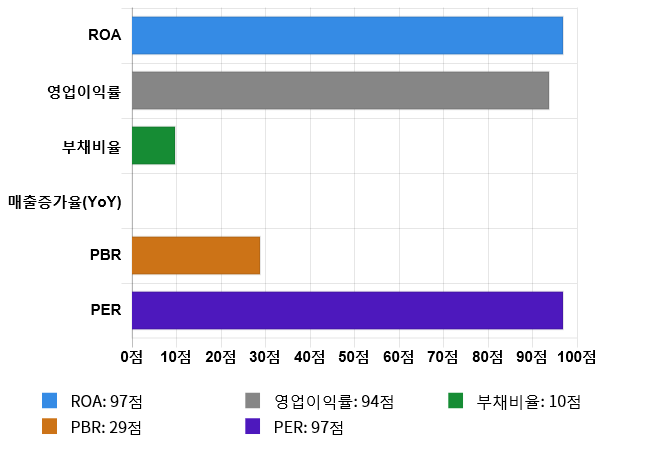 (위의 AI인공지능 점수는 재무 데이터를 기반으로 전체 상장 종목과 비교/분석하여 도출한 점수로 높은 점수가 반드시 높은 수익률을 보장하지 않습니다. 위의 자료는 당사의 추천 종목이 아니며, 투자 시 참고용으로 제시해드리는 것입니다.)
