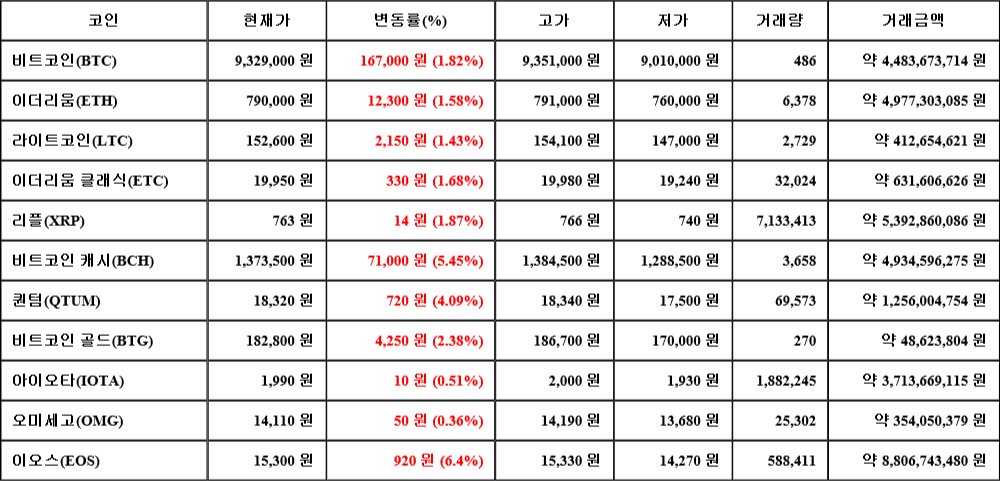 또한, 비트코인 캐시(5.45%, 1,373,500원), 퀀텀(4.09%, 18,320원), 비트코인 골드(2.38%, 182,800원), 리플(1.87%, 763원), 이더리움 클래식(1.68%, 19,950원), 이더리움(1.58%, 790,000원), 라이트코인(1.43%, 152,600원), 아이오타(0.51%, 1,990원), 오미세고(0.36%, 14,110원)은 상승세를 보이고 있다.
