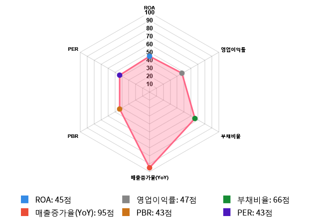 그리고 안정성(부채비율) 역시 도드라지는 편이다. 안정성 점수는 66점으로 두번째로 높은 점수를 기록했다. 부채비율은 전체 시장 내 1268위를 기록하며 상위 34.48%에 위치했다. 업종별로는 163위를 기록하며 상위 21.55%에 위치했다.