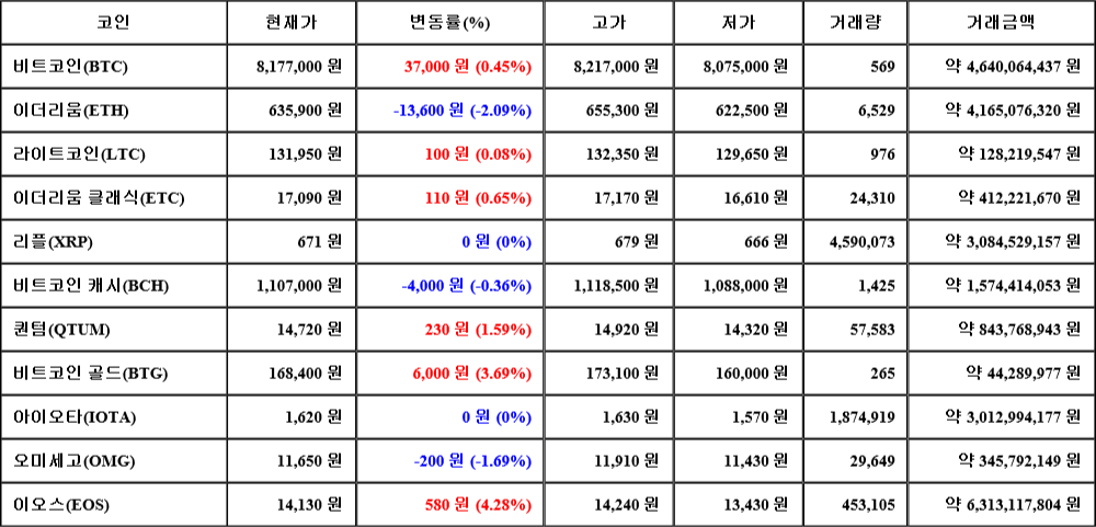 가장 큰 상승세를 보이는 가상화폐는 이오스이다. 이오스은 24시간 전 대비 4.28% 상승한 14,130원에 거래되고 있다.