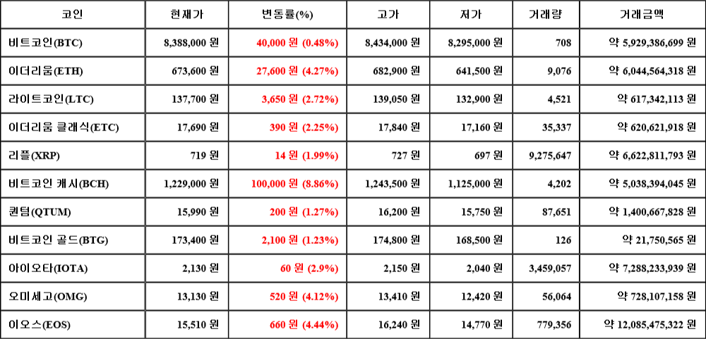 현재 암호화폐 거래소 "코인원"에 따르면 가상화폐 대장 격인 비트코인의 시세는 24시간 전 대비 40,000원(0.48%) 상승한 8,388,000원에 거래되고 있다.