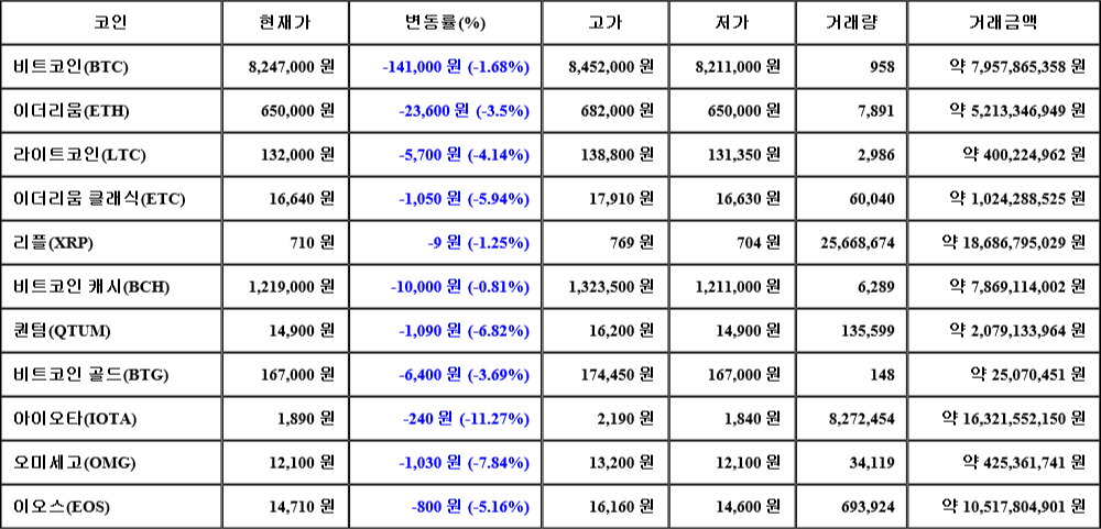 현재 암호화폐 거래소 "코인원"에 따르면 가상화폐 대장 격인 비트코인의 시세는 24시간 전 대비 141,000원(-1.68%) 하락한 8,247,000원에 거래되고 있다.