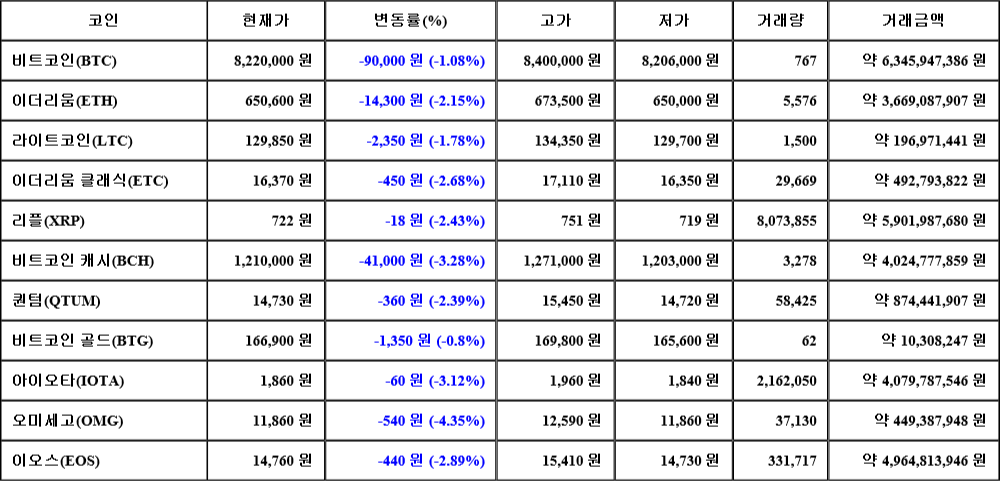 또한, 비트코인 캐시(-3.28%, 1,210,000원), 아이오타(-3.12%, 1,860원), 이오스(-2.89%, 14,760원), 이더리움 클래식(-2.68%, 16,370원), 리플(-2.43%, 722원), 퀀텀(-2.39%, 14,730원), 이더리움(-2.15%, 650,600원), 라이트코인(-1.78%, 129,850원), 비트코인 골드(-0.8%, 166,900원)은 하락세를 보이고 있다.