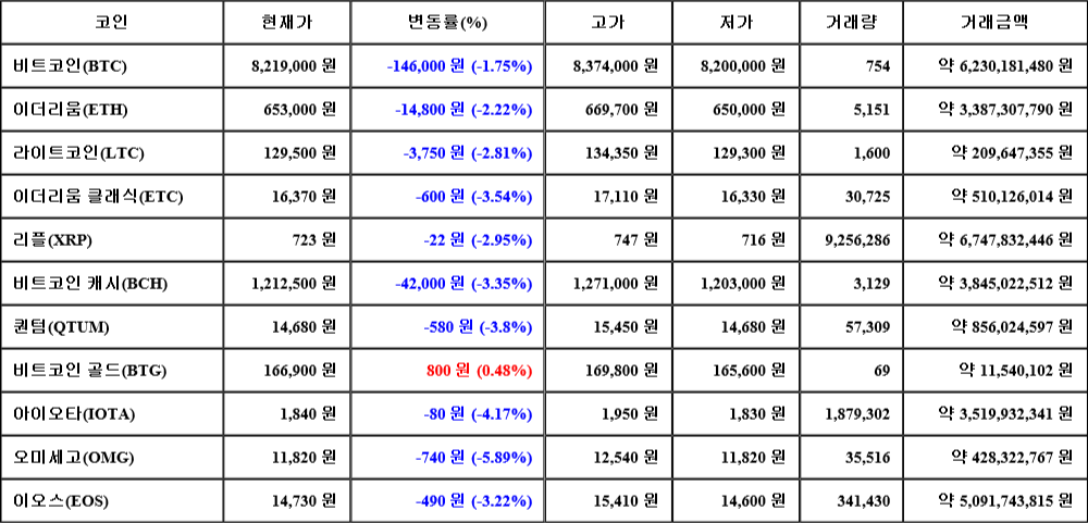 현재 암호화폐 거래소 "코인원"에 따르면 가상화폐 대장 격인 비트코인의 시세는 24시간 전 대비 146,000원(-1.75%) 하락한 8,219,000원에 거래되고 있다.