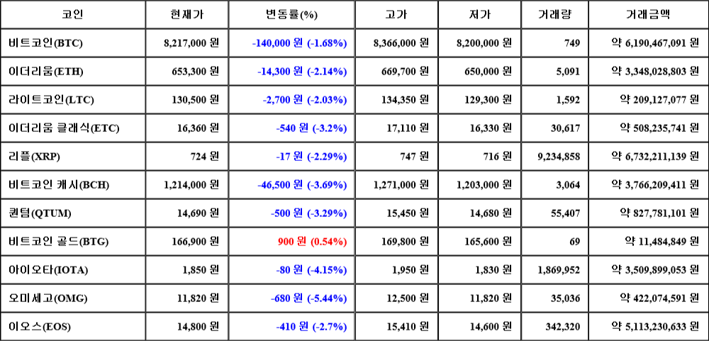 현재 암호화폐 거래소 "코인원"에 따르면 가상화폐 대장 격인 비트코인의 시세는 24시간 전 대비 140,000원(-1.68%) 하락한 8,217,000원에 거래되고 있다.