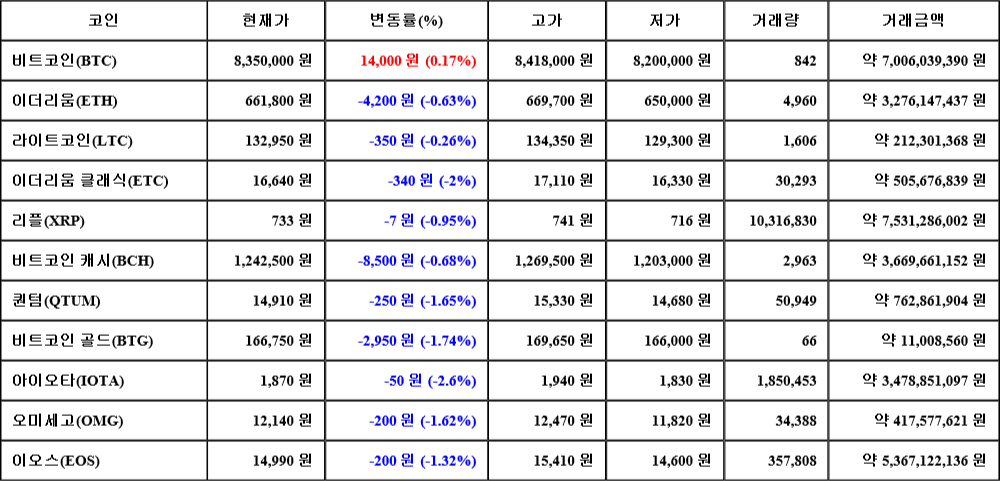 현재 암호화폐 거래소 "코인원"에 따르면 가상화폐 대장 격인 비트코인의 시세는 24시간 전 대비 14,000원(0.17%) 상승한 8,350,000원에 거래되고 있다.