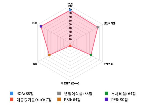 그리고 효율성(ROA) 역시 도드라지는 편이다. 효율성 점수는 88점으로 두번째로 높은 점수를 기록했다. ROA는 전체 시장 내 227위를 기록하며 상위 11.57%에 위치했다. 업종별로는 101위를 기록하며 상위 17.48%에 위치했다.