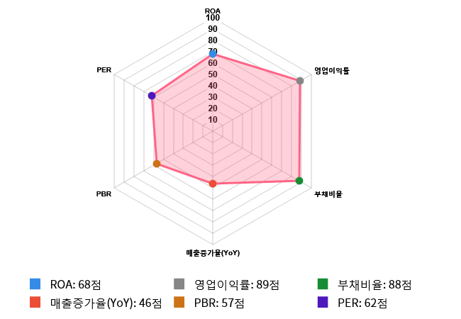 그리고 안정성(부채비율) 역시 도드라지는 편이다. 안정성 점수는 88점으로 또한 가장 높은 점수를 기록했다. 부채비율은 전체 시장 내 260위를 기록하며 상위 12.02%에 위치했다. 업종별로는 31위를 기록하며 상위 7.92%에 위치했다.