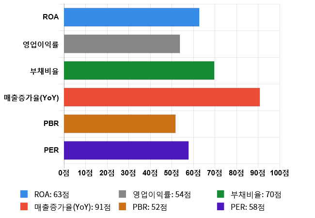 (위의 AI인공지능 점수는 재무 데이터를 기반으로 전체 상장 종목과 비교/분석하여 도출한 점수로 높은 점수가 반드시 높은 수익률을 보장하지 않습니다. 위의 자료는 당사의 추천 종목이 아니며, 투자 시 참고용으로 제시해드리는 것입니다.)